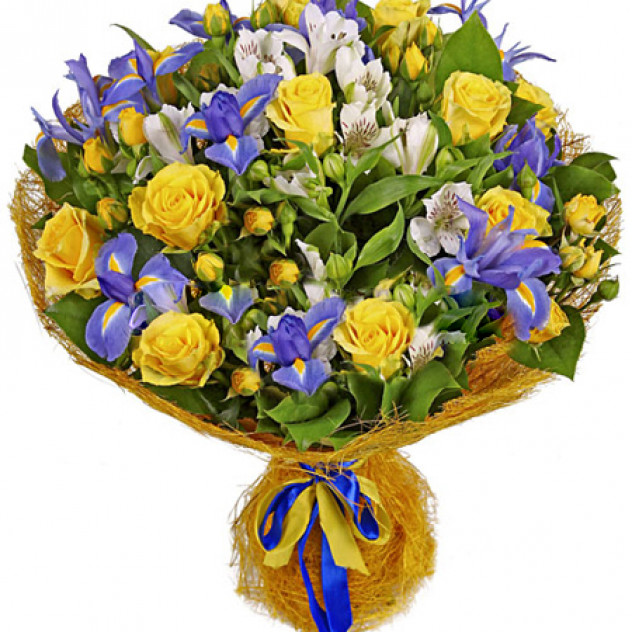 Состав: Ирис 10шт., Упаковка для букета: сезаль, Роза кустовая 7шт., Альстромерия 5шт., Салал 10шт., Роза желтая 60 см 10шт.