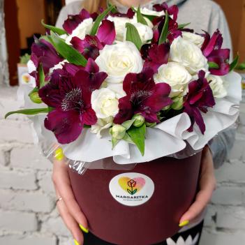 Аккуратная и стильная композиция с розами и хризантемами в шляпной коробке, дарит прекрасный аромат и является прекрасной идеей для оригинального подарка!