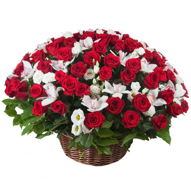 Состав:Упаковка (пленка с лентой) 3шт., Лизиантус 15шт., Роза красная 60 см 101шт., Корзина плетеная, Пиафлор (оазис) 5шт., Орхидея цимбидиум (ветка) 2шт.
